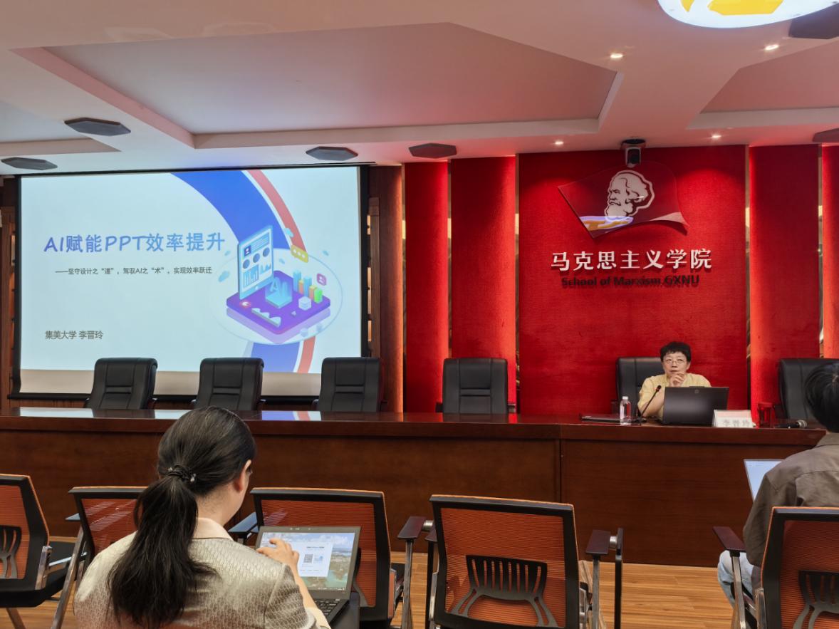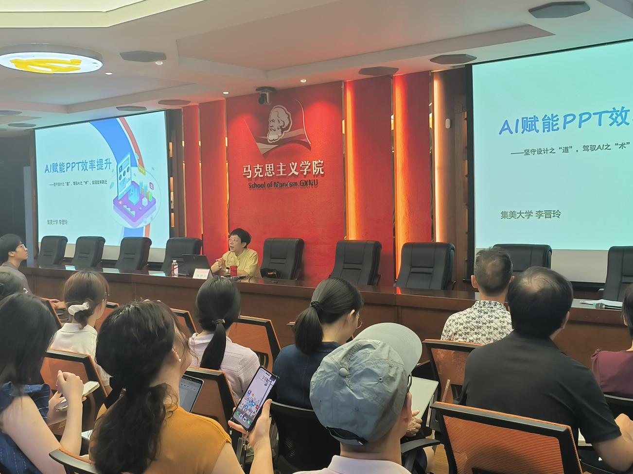 授课环节中,李晋玲教授紧扣思政课教学实际需求,围绕 “PPT的设计原则”“AI赋能全流程”“提高效率技巧” 三大核心板块展开深入讲解。她以 “思政课PPT需兼顾政治性与艺术性” 为核心准则,从智能主题构思、教学内容逻辑梳理,到视觉元素重塑与版式优化,系统拆解实用方法;同时结合具体案例,详细演示如何借助AI工具简化PPT制作流程、提升内容呈现效果,并将理论转化为可直接应用的实战技巧,帮助教师解决日常课件制作中的痛点问题。