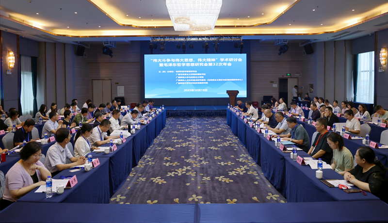 为深入学习领会习近平总书记关于党的历史和理论的重要论述,深入体会一百多年来党在领导人民进行伟大斗争中形成的伟大思想和伟大精神,进一步推动毛泽东思想特别是毛泽东哲学思想研究,助推为全面建设社会主义现代化国家、全面推进中华民族伟大复兴提供坚强思想保证、强大精神力量的工作,在中央红军长征胜利90周年,中国人民抗日战争暨世界反法西斯战争胜利80周年以及中共七大确立毛泽东思想为党的指导思想并写入党章80周年之际,10月18日,中国马克思主义哲学史学会毛泽东思想研究分会(毛泽东哲学思想研究会)与广西马克思主义学院联盟秘书处、广西师范大学马克思主义学院、广西高校人文社科重点研究基地(马克思主义理论与区域实践研究中心)、广西师范大学中共党史党建研究院在桂林联合举办了“伟大斗争与伟大思想、伟大精神”学术研讨会暨毛泽东哲学思想研究会第32次年会。来自中共中央党校、中共中央党史和文献研究院、中共中央对外联络部、山东省社科联、山东社会科学院、中共四川省委党校、中共广西区委党校、北京师范大学、浙江大学、湘潭大学、陕西师范大学、广西大学、上海对外经贸大学、上海外国语大学、南京理工大学、贵州大学、延安大学、南方医科大学、河北工程大学等相关机构和高校,以及《毛泽东邓小平理论研究》《毛泽东研究》《毛泽东思想研究》《长征学刊》等刊物的近100位专家学者,围绕“伟大斗争与伟大思想、伟大精神”的会议主题,进行了深入交流研讨。