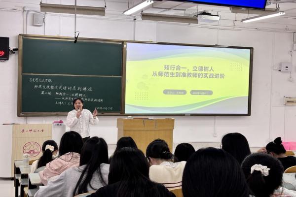 王欣欣老师以“知行合一,立德树人”为主题,从角色觉醒、备课革命、课堂掌握、求职决胜和立德树人等五个方面展开讲解,通过其自身的经验分享,为师范生实现从学生到教师身份的转换提供帮助和指导。在角色觉醒环节,她指出师范生身份转换时常面临角色模糊、权威恐慌等心理关卡,强调实习教师需逐步建立自我认同,把握师生交往分寸,在课堂中做到收放自如。围绕备课革命这一话题,她认为实习教师在备课时要善于将抽象概念生活化,并借助情景模拟、价值辩论等方法丰富互动场景,把教材讲活。在课堂掌握部分,王老师通过真实案例解析突发事件的应对技巧,分享了如何用非语言暗示、正面提醒与私下沟通等灵活方式来引导学生。针对目前同学们普遍关心的求职问题,她结合多年面试官经验,给出了面试前深入了解学校文化、简历数据化、优化面试过程等诸多宝贵建议。最后,王欣欣老师勉励同学们以“德”为舵、以“行”为帆,践行育人初心。
