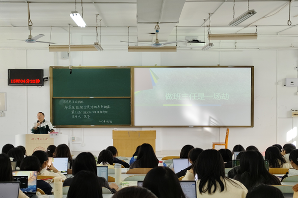 为深化师范生对班主任工作的认知,夯实教学实践技能,11月27日,马克思主义学院2023级思想政治教育专业全体本科生于文四区304教室进行师范生技能培训系列讲座第三场——《班主任工作经验介绍》。本次讲座由广西师范大学附属外国语学校吴华老师主讲。