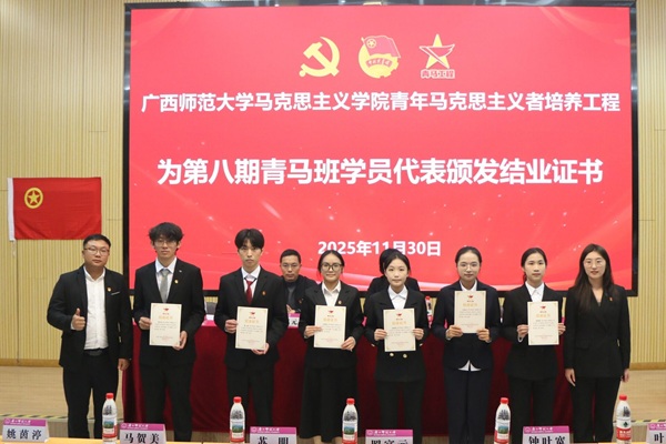作为全国高校重点马克思主义学院,学院始终立足地域特色,将“壮美广西”建设与青年培养深度融合。近年来,青马工程累计培育学员500余名。未来,马克思主义学院将以“大思政课”建设为牵引,进一步优化“青马工程”培养体系,引导学员在乡村振兴、边疆治理等国家战略中贡献青春智慧,努力培养一批“政治坚定、理论扎实、能力突出”的马克思主义时代新人,为谱写中国式现代化广西篇章提供坚实人才支撑。
