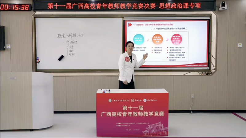 全区高校青年教师教学竞赛由自治区教育厅、自治区总工会联合主办,是广西辐射面最广、组织规模最大、专业权威性最强的高等教育教学类标杆赛事,是自治区教育厅为全区高校青年教师搭建的提升教学能力和业务水平的实践平台。本次青教赛设立文科组、理科组、工科组、思政组和医科组等五个组别,设置教学设计、课堂教学、教学反思三个竞赛环节,对教师教学基本功、教学水平、教学特色进行全面检验和评价。经过激烈的角逐,思政组共评选出一等奖5 名,二等奖 9 名,三等奖 16 名。