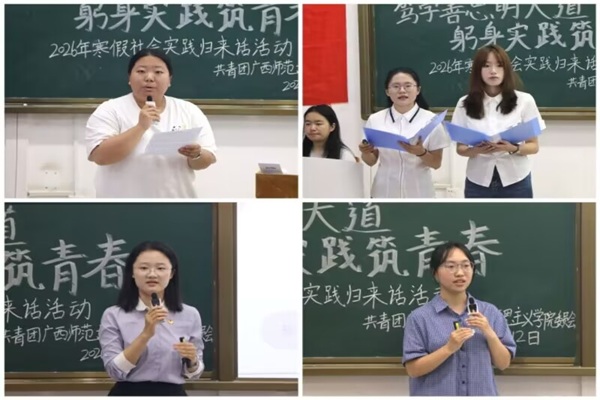 为深入贯彻落实学校关于实践育人的工作部署,全面总结2026年寒假社会实践成果,促进经验交流与成果共享,4月12日晚,马克思主义学院于雁山校区文四区301教室举办“笃学善思明大道,躬身实践筑青春”2026年寒假社会实践归来话活动。学院团委副书记冯回老师、2025级本科生兼职辅导员蒋玟珈、2024级团支部代表、优秀实践团队代表以及2025级全体本科生出席本次活动。