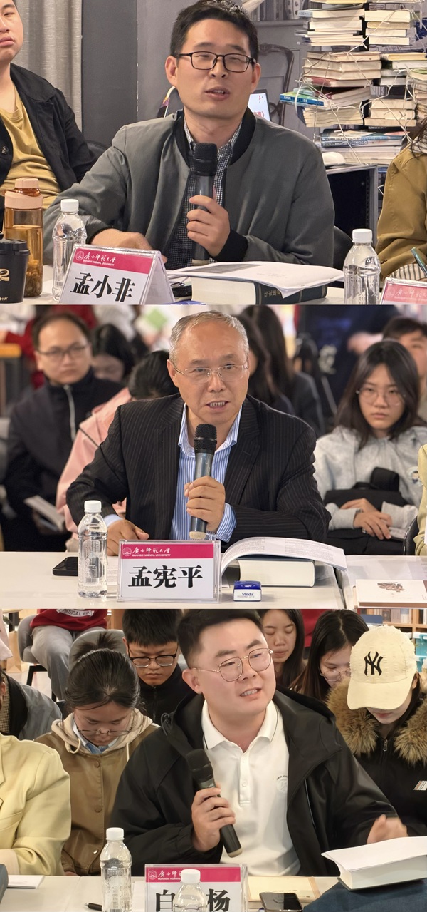 在师生共读环节,与会师生围绕经典文本的核心命题与现实关照展开深入研讨。孟宪平院长聚焦经典阅读的方法论,强调要把握文本结构、序言背景与核心观点,坚持理论运用与历史条件相统一。孟小非老师从时间性、空间性、因果性三个维度对《共产党宣言》进行解读,为理解经典作家认识世界的独特方式提供了全新视角。白杨老师聚焦文本本身,将《共产党宣言》的核心逻辑概括为“斗争”主线,通过“为什么斗、谁来斗、斗什么、怎么斗”的设问串联文本内容,提出要以时间、方法、历史、实践四个维度开展研读。师生在共读中进行经典与时代的深度对话,与会学生围绕研读方法、核心观点与时代发展等话题分享个人阅读感悟。