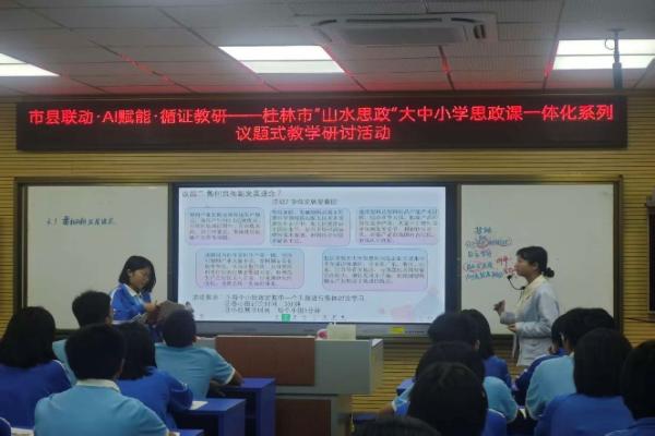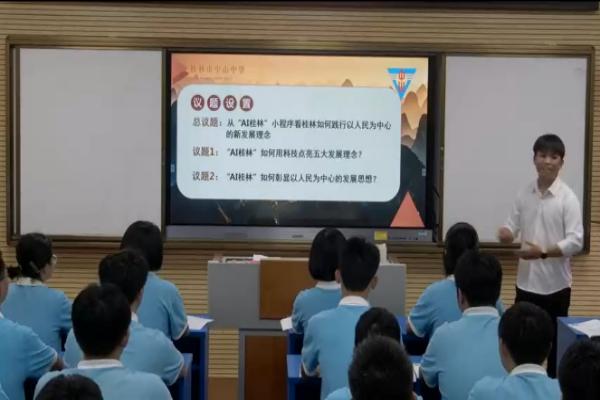 此次教研活动以高一新教材《贯彻新发展理念》为课例,采取“同课异构”的形式开展教学展示。桂林市逸仙中学唐雅蔓老师以“从塑料的‘蜕变’看新发展理念”为总议题,引导学生化身“发展智囊团”,从塑料瓶改造切入现实产业问题,让学生在实践与思辨中体会新发展理念的现实意义。桂林市中山中学陆长潮老师则借助“AI桂林”文旅大模型这一本土案例,设计出层层递进的探究任务,引导学生在真实情境中理解创新、协调、绿色、开放、共享的发展理念,充分展现人工智能作为教学辅助工具的有效性和创新性。